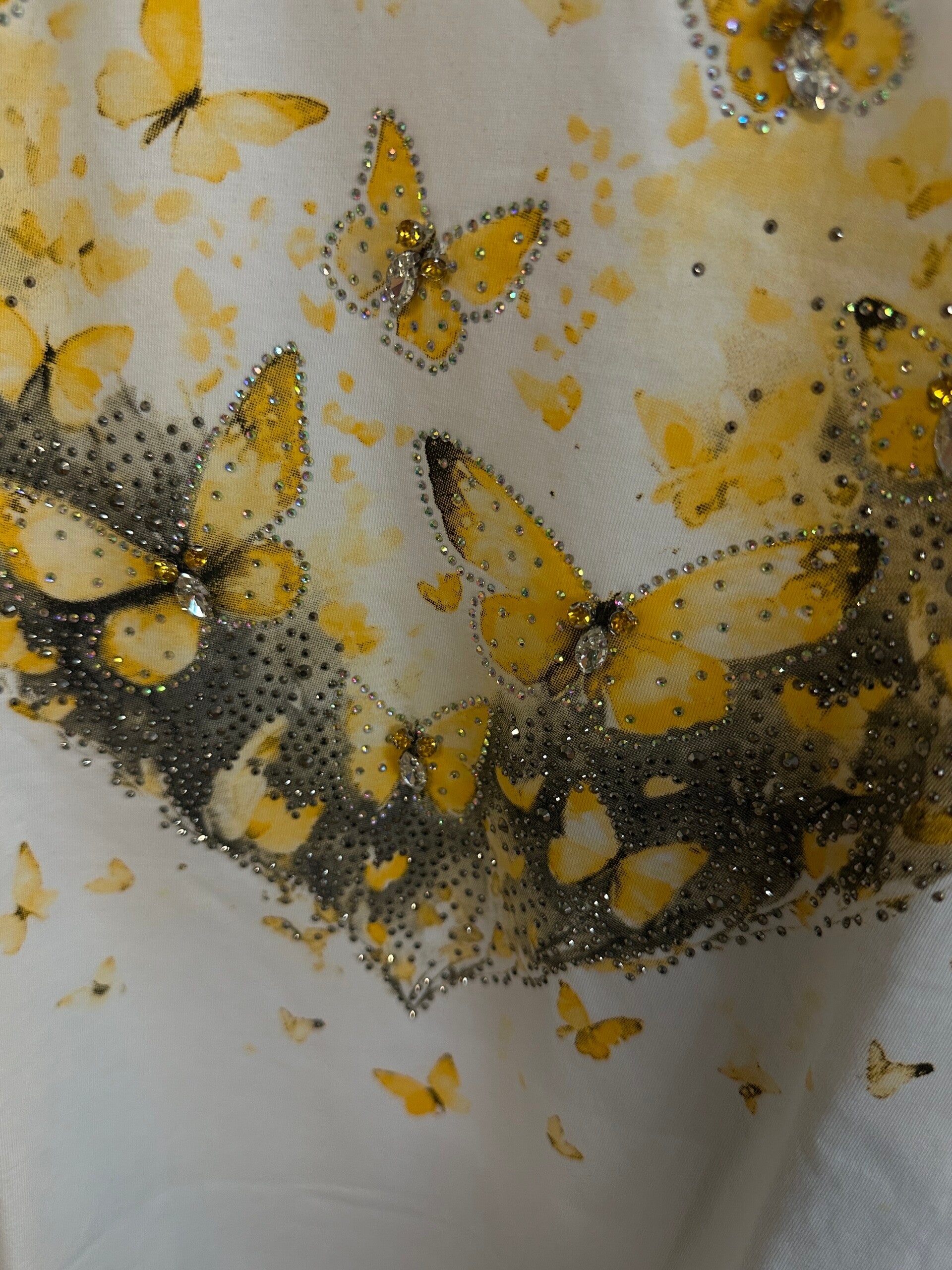 T-shirt stampa farfalle bianca/giall , strass e brillantini