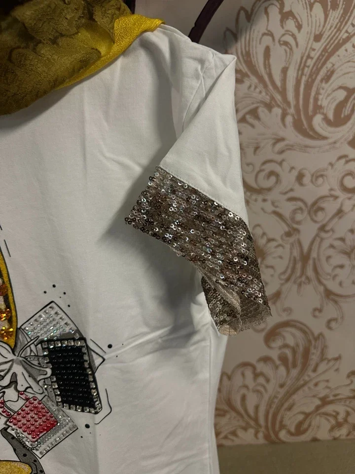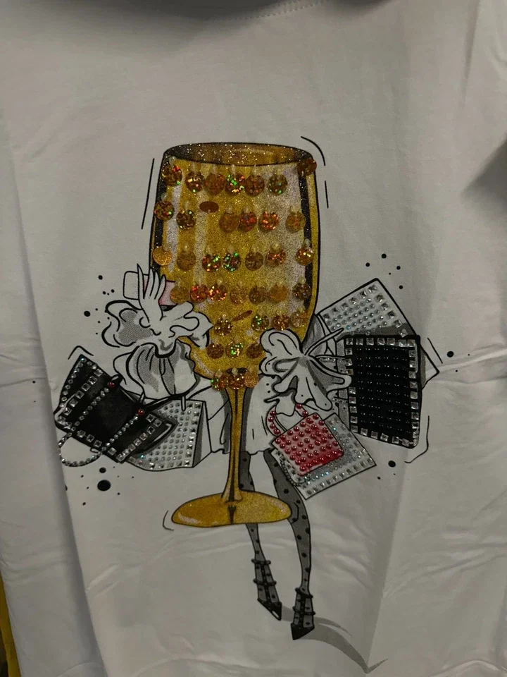 T-shirt stampa bicchiere, applicazioni strass , finitura maniche ocn tulle e paiettes