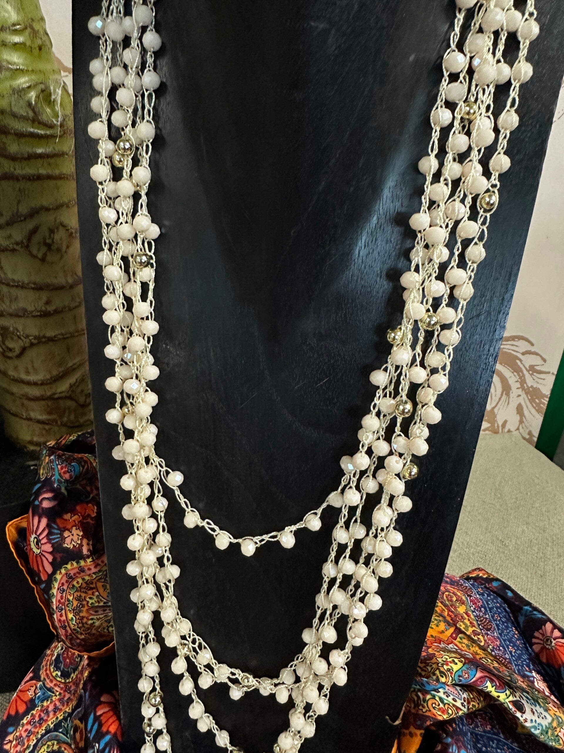 Collana multifilo macramè, gancio, cristallini, colore bianco panna