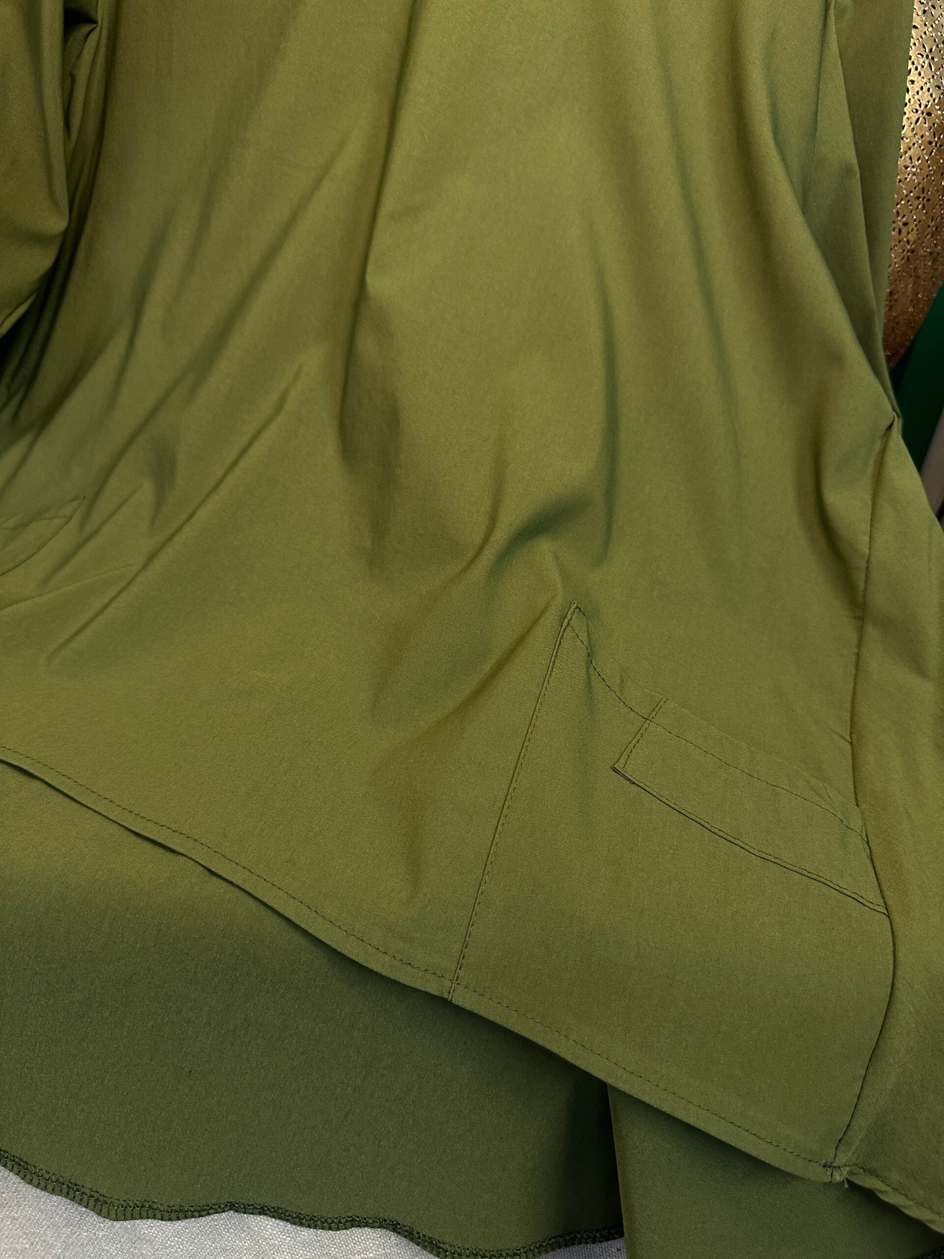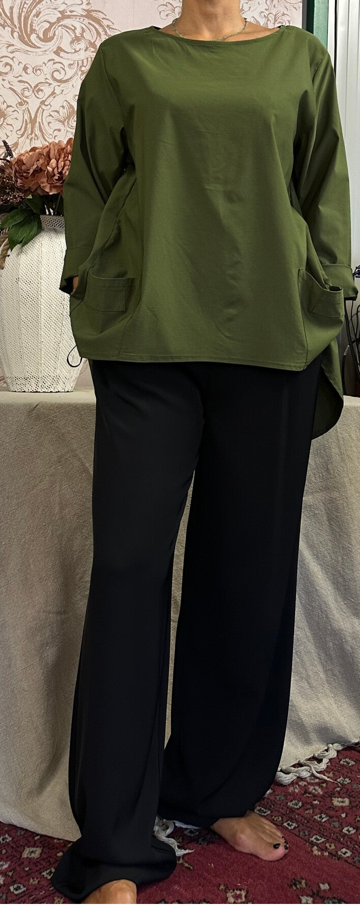 Maglia, tessuto leggero viscosa-elasten, più lungo sul retro, due piccole taschine davanti.Manica 3/4 Taglio ampio e svasato. Vestibilità comoda. Taglia unica.