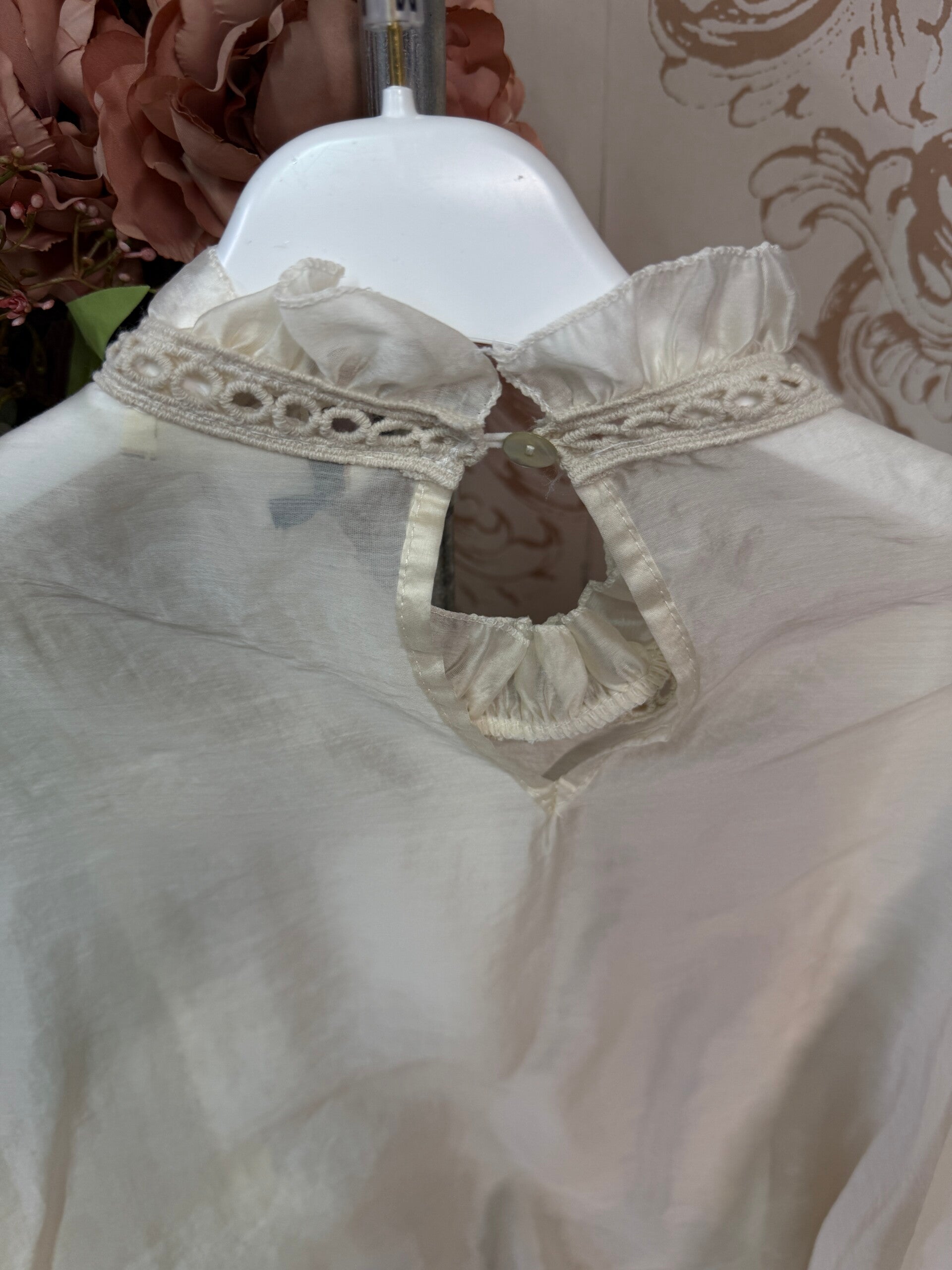 Camicia Alramira Milano, colore burro, fiori applicati ricamati, polsi con elastico tg M/L, vestibilità stretta, veste una S, 85% lyocel ( nuovissimo materiale di orgine naturale) , 15% poliestere